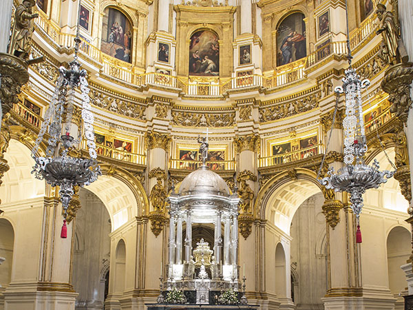 Until his death in 1563, Siloé transformed the Gothic east end into a classical interior by constructing a circular space that evokes both the Pantheon in Rome and the Holy Sepulchre in Jerusalem. Both references are highly significant, since it was apparently intended at one point by Charles V to become a Royal Pantheon (i.e. mausoleum), and also because it may have symbolised the Christian triumph over the infidel in the West, as represented by the eucharistic monstrance beneath the baldachin shown in a print engraved upon the completion of the circular High Chapel. Another very significant feature designed by Siloé is the Portal of Forgiveness on the exterior of the transept.
